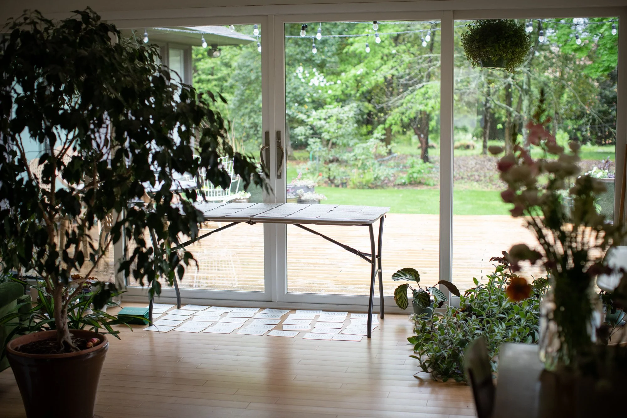 Rainy day for my sunroom/wedding prep station. Not only does it hold all of my plant/flower collection, but is now a drying station for all of the invitations!
