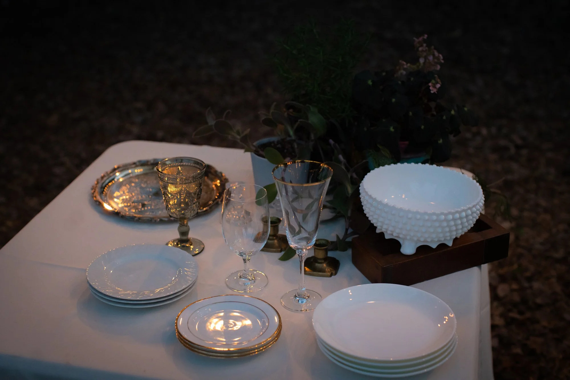 These tables represent pieces that will go on the serving tables as well as the eating tables. Disregard the type of pieces or all of the tarnish. It’s kind of a hodgepodge, but worked for what we set out to do.